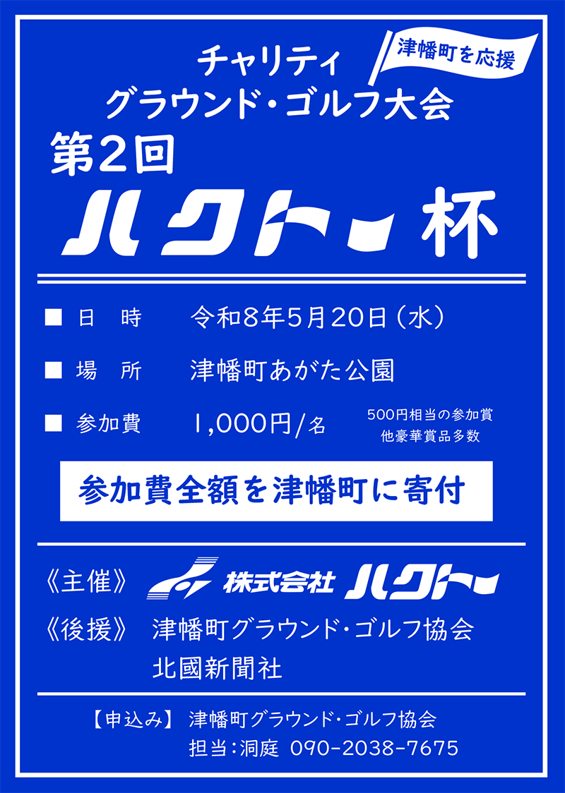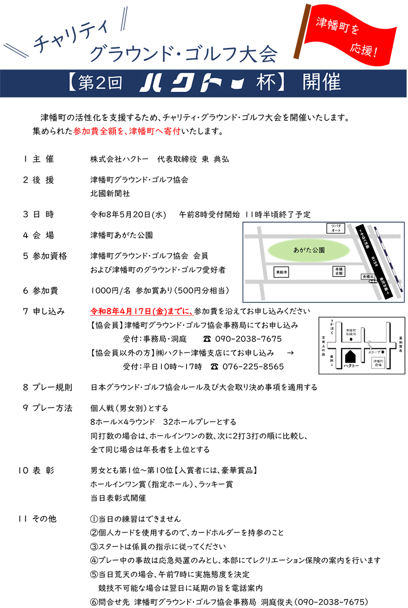 津幡町の活性化を支援するため、チャリティ・グラウンド・ゴルフ大会を開催いたします。